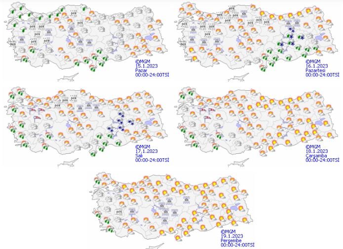 Yağışların yağmur ve sağanak, İç Anadolu’nun güneydoğusunun yüksekleri, Doğu Akdeniz’in iç kesimlerinin yüksekleri ve Malatya’nın yüksek kesimlerinde karla karışık yağmur ve kar şeklinde görüleceği tahmin ediliyor. İç ve doğu kesimlerde yer yer pus ve sis bekleniyor.