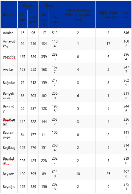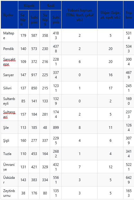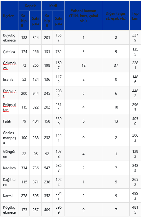 İstanbul'un 39 ilçesindeki kayıtlı vakalar şöyle: