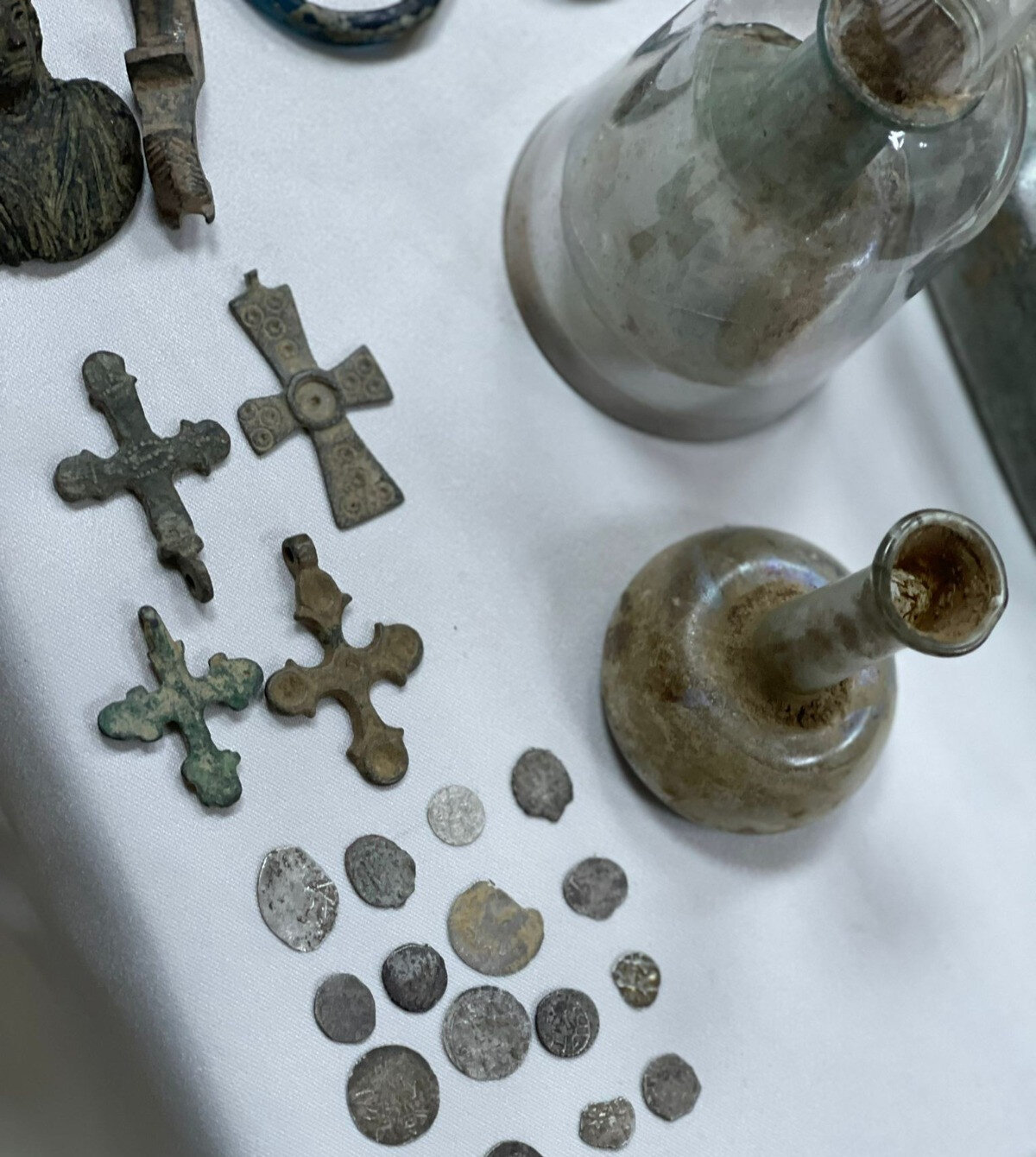 Adreslerde yapılan aramalarda çeşitli dönemlere ait sikke, haç, yüzük, mızrak ucu ve cam objelerin de aralarında bulunduğu 227 parça tarihi eser ele geçirildi.