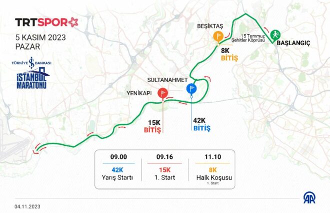 Cumhuriyet’in 100. yılının da kutlanacağı Türkiye İş Bankası’nın isim sponsorluğundaki maratonun startı, saat 09.00’da Anadolu yakasında 15 Temmuz Şehitler Köprüsü gişelerinin yaklaşık 250 metre öncesinden verilecek. Köprüyü geçtikten sonra Beşiktaş sapağından ayrılarak Barbaros Bulvarı’ndan Beşiktaş’a inecek sporcular, sahil yolunu izleyerek Karaköy’e ulaşacak.