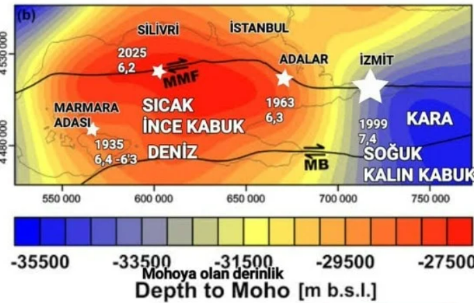 Sözcü'den Sonuç Sürmeli'nin haberine göre, haritada mavi ile işaretlenen kara alanlarında ise yer kabuğu daha kalın (yaklaşık 17 km) ve soğuk. Bu durum, fayları kilitliyor ve enerji birikiminin aniden boşalmasıyla, 1999 İzmit Depremi gibi 7’den büyük depremlere yol açıyor.