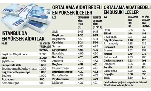 Yapılan aidat araştırmasına göre İstanbul’da markalı konut projelerinde 100 metrekarelik daireler için ödenen ortalama aylık aidat bedeli 400-450 TL. Ama aidatlar daire başına 3 bin 500 TL’ye kadar da çıkıyor.