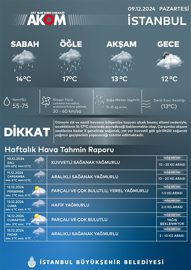 İstanbul Büyükşehir Belediyesi (İBB) Afet Koordinasyon Merkezi (AKOM), yaptığı açıklamada Marmara Bölgesi’nde hava sıcaklıklarının 14-17 derece seviyesinde, mevsim normallerinin üzerinde seyredeceğini belirtti. AKOM, akşam saatlerinden itibaren İstanbul’da gök gürültülü sağanak yağış geçişlerinin etkili olacağını duyurdu.