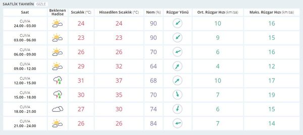 Meteoroloji tarafından yayınlanan hava tahmin raporuna göre, saat 12.00 - 18.00 arasında il genelinde sağanak yağış bekleniyor. Saat 18.00'den sonra ise sağanak yağışın etkisini yitirmesi bekleniyor.