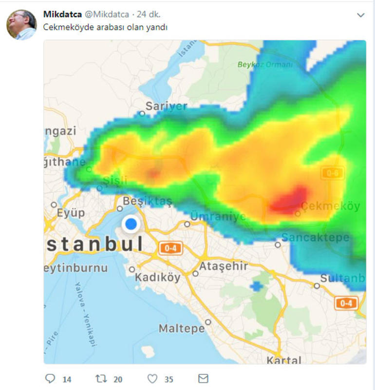 Öte yandan yağışla ilgili olarak Meteoroloji uzmanı Prof. Dr. Mikdat Kadıoğlu, sosyal medya adresinden, "Çekmeköy'de arabası olan yandı" mesajını paylaştı.