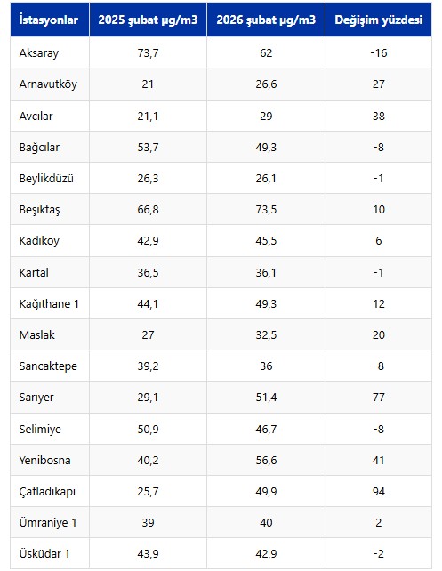 Şubat 2026'da kentte azot dioksit hava kirliliğinin en fazla ölçüldüğü istasyon, metreküp başına 73,5 mikrogramla Beşiktaş oldu. Bunu sırasıyla metreküp başına 62 mikrogramla Aksaray, 56,6 mikrogramla Yenibosna istasyonları takip etti.