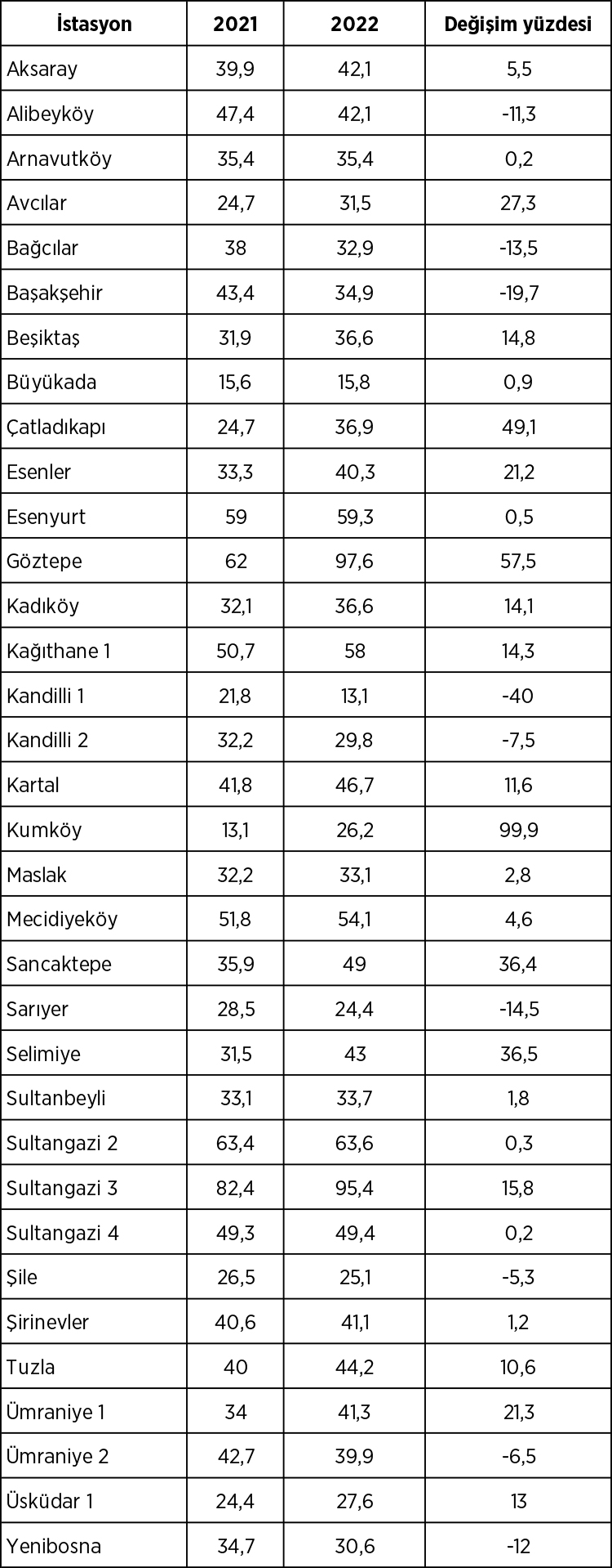 İstanbul'da bulunan istasyonların hava kirliliği (PM10) ortalaması şu şekilde oldu:
