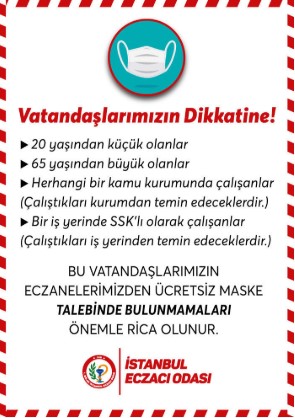 Bu kapsamda, İstanbul'daki eczanelerde 20 yaşından küçük ve 65 yaşından büyük vatandaşlar ile söz konusu çalışanlara maske dağıtımı yapılmayacak.