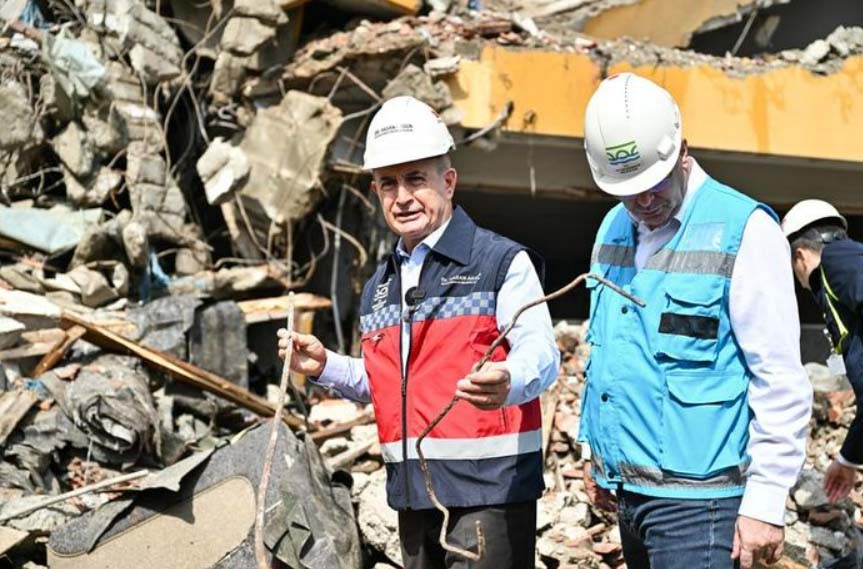Yıkımı gerçekleştirilen binada incelemeler yapan Akgün, beton ve demirlerdeki teknik eksiklikleri gazetecilere gösterdi.
