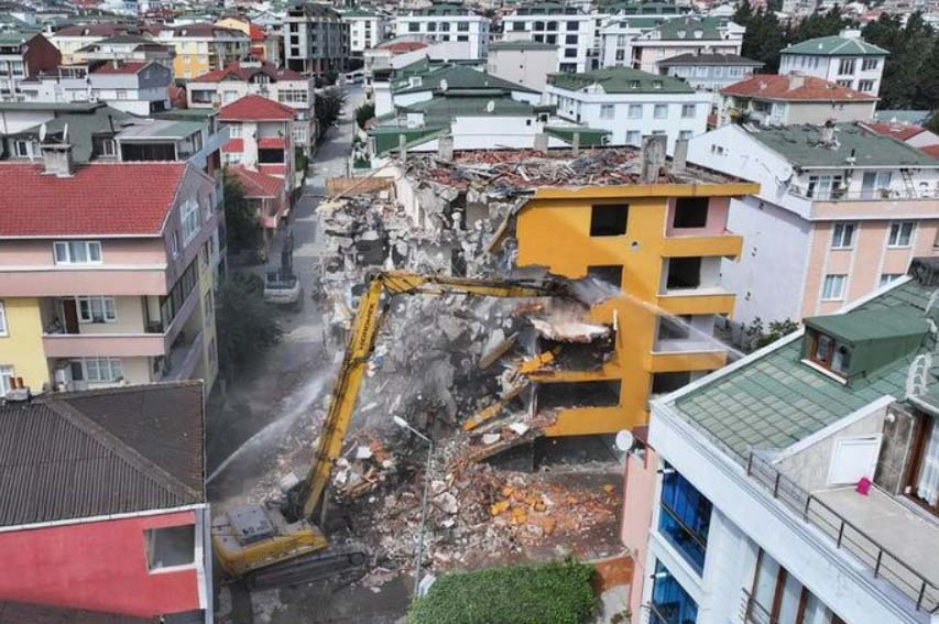 Ulus Mahallesi'nde 12 bağımsız bölümden oluşan 5 katlı riskli yapının yıkım çalışmalarını, Büyükçekmece Belediye Başkanı Hasan Akgün de takip etti.