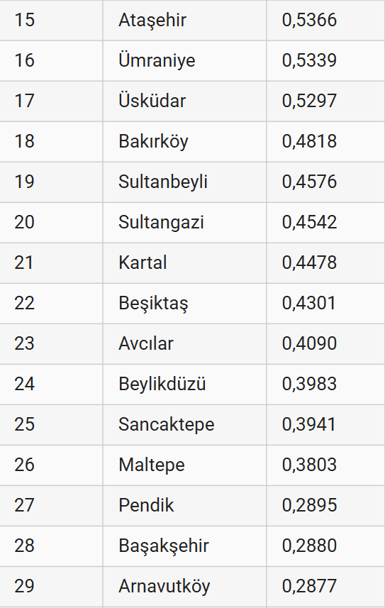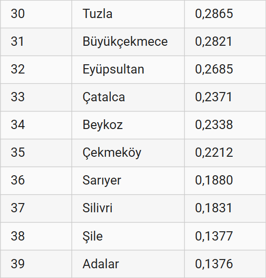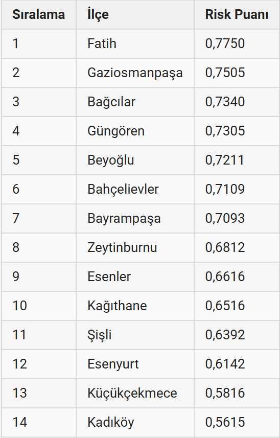 Çalışmaya göre, sel riskinin en fazla olduğu ilçeler, Fatih, Gaziosmanpaşa, Bağcılar, Güngören ve Beyoğlu, en az olduğu ilçeler ise Adalar, Şile, Silivri, Sarıyer ve Çekmeköy olarak belirlendi.