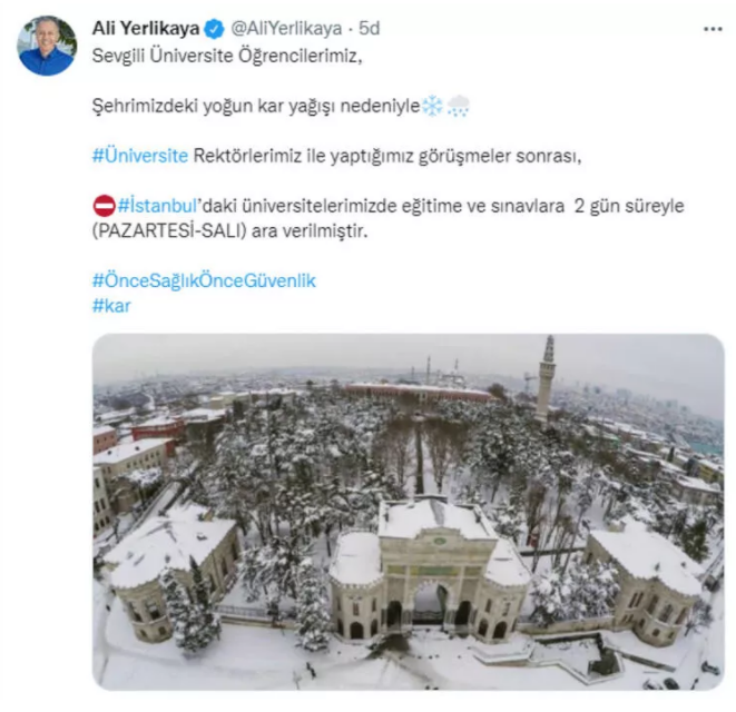 İstanbul Valisi Ali Yerlikaya sosyal medya hesabından yaptığı açıklamada, "Sevgili Üniversite Öğrencilerimiz, şehrimizdeki yoğun kar yağışı nedeniyle üniversite rektörlerimiz ile yaptığımız görüşmeler sonrası İstanbul’daki üniversitelerimizde eğitime ve sınavlara 2 gün süreyle (PAZARTESİ-SALI) ara verilmiştir." dedi.