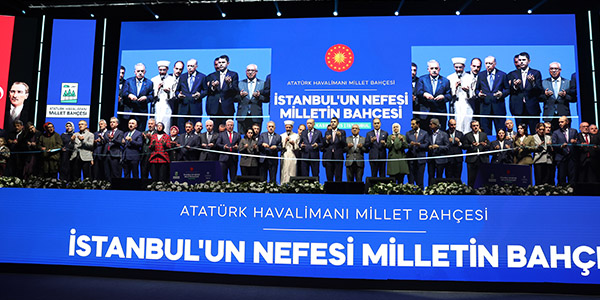 Birazdan yapımı tamamlanan Atatürk Havalimanı Millet Bahçesi'nin açılışını birlikte yapacaklarını aktaran Erdoğan, "Üstat ne diyor? 'Denizle toprağın visale erdiği' bu muhteşem şehri, yeşilin 1001 tonuyla, ağaçlarla, bahçelerle, renk renk çiçeklerle donatmanın heyecanını hep birlikte yaşayacağız. Yeni millet bahçemizde şehrimize nefes aldıracak, İstanbul'un çehresini güzelleştirecek dev bir eseri daha milletimize kazandırmış olacağız. Çevre Bakanlığımızı, TOKİ'mizi, yüklenici firmamızı işçisinden mimar ve mühendisine, şehre imzamızı attığımız bu muhteşem eserde emeği geçen herkesi yürekten tebrik ediyorum." diye konuştu.