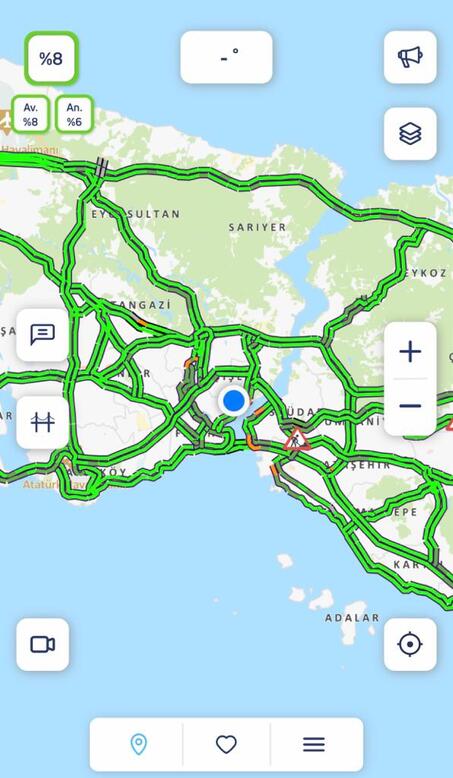 İstanbul Büyükşehir Belediyesi (İBB) trafik yoğunluk haritasında saat 08.30'da trafiğin yüzde 8 olduğu görüldü. D-100 Karayolu Darülaceze mevkiinde, Haliç Köprüsü ve Mecidiyeköy yönünde araçlar rahatlıkla ilerledi.