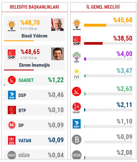 Saat 23.40'dan itibaren İstanbul sonucuyla ilgili bir paylaşım yapmayan AA, 02.40'ta yeniden sonuç açıkladı. Saat 02.40 itibariyle İstanbul genelindeki sandıkların yüzde 98.80'i açılmış durumda. Şu ana kadarki sonuçlara göre, Cumhur İttifakı'nın adayı Binali Yıldırım yüzde 48.70, Millet İttifakı'nın adayı Ekrem İmamoğlu ise yüzde 48.65 oy oranına sahip. İki aday arasındaki oy farkı 4 bin civarında bulunuyor.