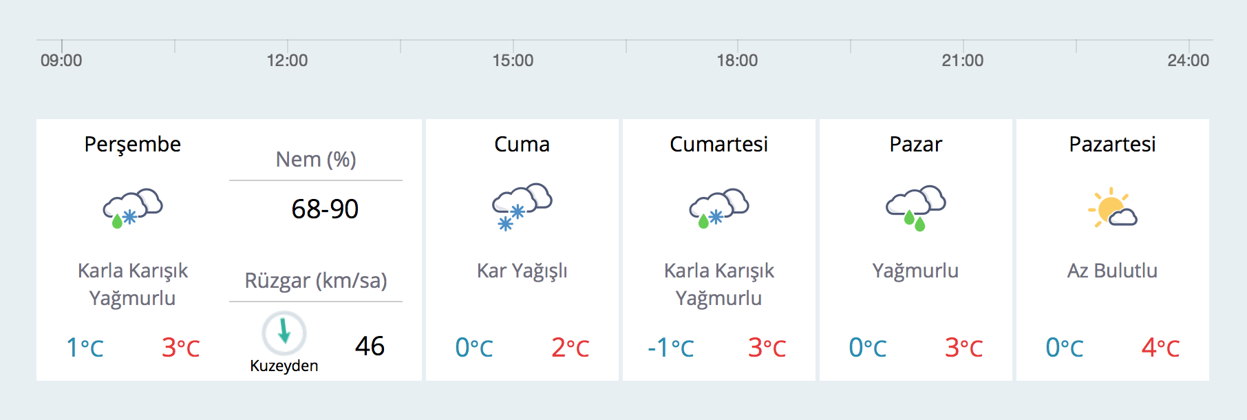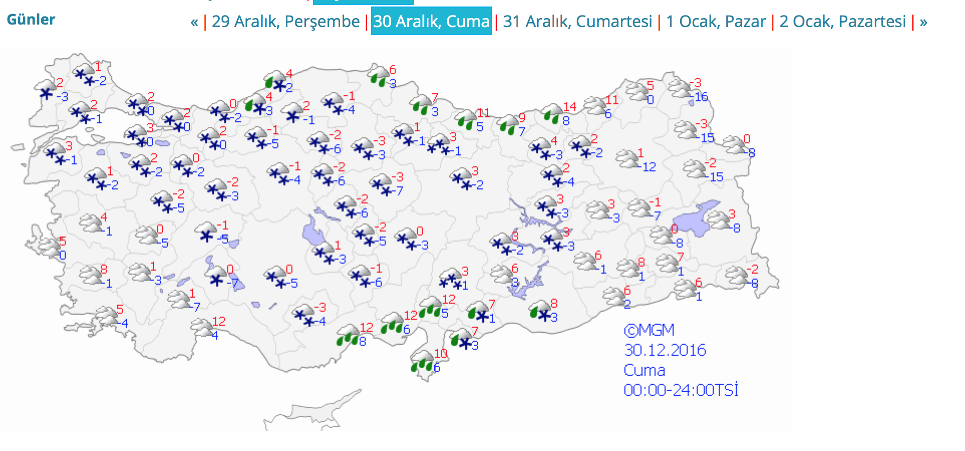 Yapılan son değerlendirmelere göre; Ülkemiz genelinin çok bulutlu, Marmara, Ege, Akdeniz, İç Anadolu, Batı ve Orta Karadeniz, Doğu ve Güneydoğu Anadolu'nun batısının yağışlı geçeceği tahmin ediliyor. Yağışların; Akdeniz kıyıları, Batı ve Orta Karadeniz kıyıları ile Malatya, Elazığ, Kilis ve G. Antep çevrelerinde yağmur ve sağanak, yağış alan diğer yerlerde karla karışık yağmur ve kar şeklinde olması bekleniyor. Yağışların Orta ve Doğu Akdeniz kıyıları ile Sinop çevrelerinde kuvvetli, Adana çevrelerinde çok kuvvetli yağmur ve sağanak, Orta ve Doğu Akdeniz'in iç kesimleri ile Kocaeli, Sakarya, Bursa, Bilecik, Balıkesir'in kuzey kesimleri ile Çankırı çevrelerinde yoğun kar şeklinde olacağı tahmin ediliyor. Kuzeydoğu kesimlerde kuvvetli olmak üzere iç ve doğu kesimlerde buzlanma ve don olayı bekleniyor.