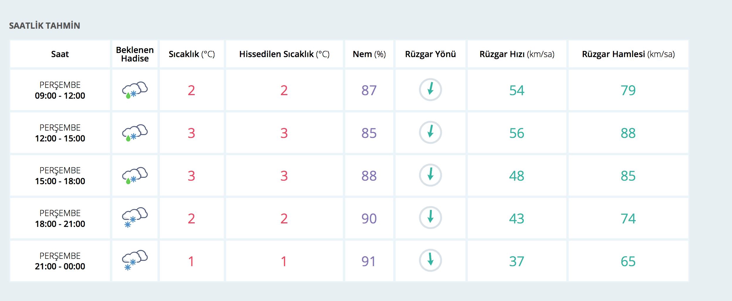 KUVVETLİ RÜZGAR UYARISI: Rüzgarın Akdeniz, İç Anadolu'nun güney ve doğusu ile Orta ve Doğu Karadeniz'in iç kesimlerinde güney ve güneydoğu yönlerden; Marmara ve Kuzey Ege'de kuzeyli yönlerden kuvvetli fırtına (60-90 km/s, hamlesi zaman zaman 100 km/saatin üzerinde) şeklinde eseceği tahmin ediliyor. Gece saatlerine kadar etkisini devam ettirmesi beklenen kuvvetli fırtınanın neden olabileceği olumsuzluklara (çatı uçması, ağaç ve direklerin devrilmesi, soba ve baca gazı zehirlenmeleri, tipi şeklinde kar yağışı, çığ tehlikesi, ulaşımda aksamalar vb.) karşı dikkatli ve tedbirli olunmalıdır.