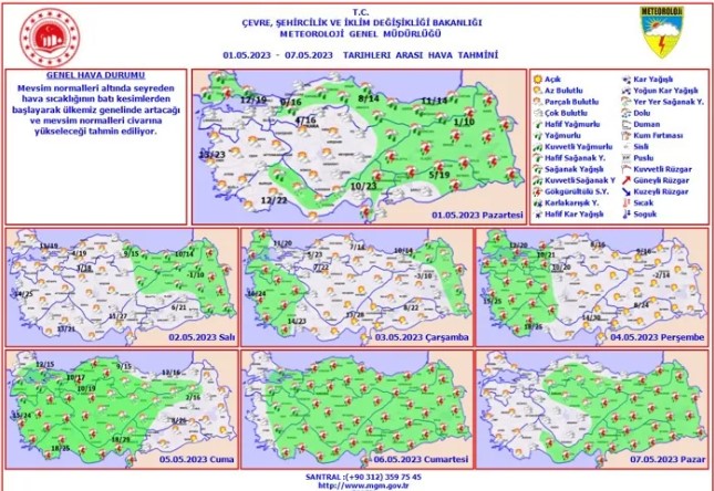 Meteoroloji 1 Mayıs 2023 Pazartesi gününe ilişkin hava durumu raporunu yayımladı. Buna göre bazı illerde yağış beklenirken, sıcaklıkların iç kesimlerde 2 ila 4 derece artacağı tahmin ediliyor. İşte 1 Mayıs 2023 yurt genelinde hava durumu...