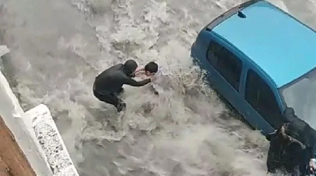 Esenyurt’ta sabah saatlerinden itibaren etkili olan yağmur sele dönüştü. Pınar Mahallesi’nde dereye dönen yokuşta, 1'i çocuk 2 kişi yolun karşısına geçmeye çalışırken, akıntıya kapıldı. Akıntıya kapılan çocuk bir süre sürüklendikten sonra park halindeki otomobile tutundu. Bir binanın altında bekleyen kişi ise çocuğu koşarak yakaladı.