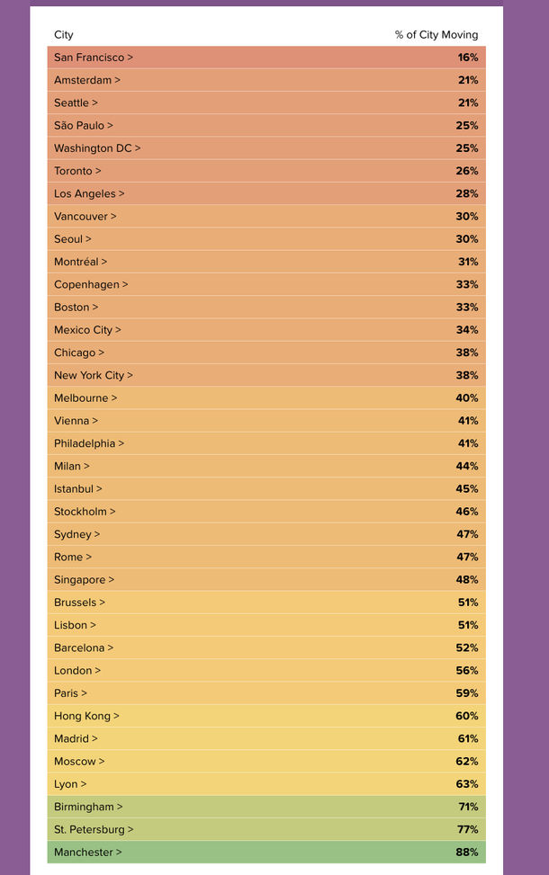 17 Mayıs’ta yüzde 16’lık oran ile San Francisco hareketliliğin en az olduğu şehir olurken, San Francisco’yu yüzde 21 ile Amsterdam ve Seattle, yüzde 25 ile Sao Paulo ve Washington DC, yüzde 26 ile Toronto, yüzde 28 ile de Los Angeles izledi.