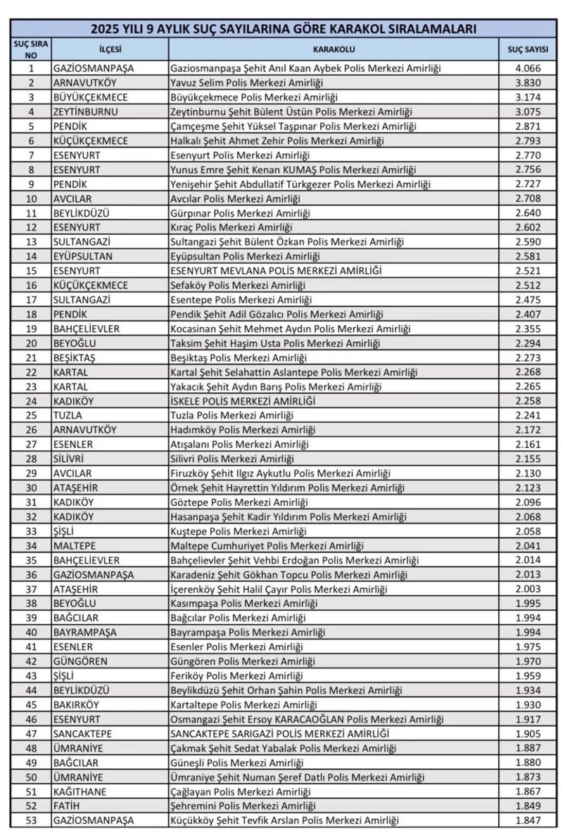 Verilere göre, yılın ilk üç çeyreğinde en fazla suç kaydı Gaziosmanpaşa Şehit Anıl Kaan Aybek Polis Merkezi Amirliği’nde tutuldu. Söz konusu merkezde 4 bin 66 ayrı suç dosyası açıldı. Listenin ikinci sırasında Arnavutköy Yavuz Selim Polis Merkezi (3 bin 830 suç kaydı), üçüncü sırada ise Büyükçekmece Polis Merkezi Amirliği (3 bin 174 suç kaydı) yer aldı.