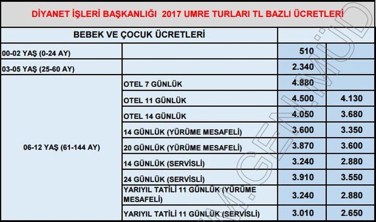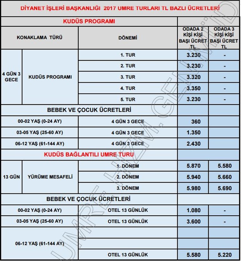 Umre fiyatları için bekleyişte olan vatandaşlara Diyanet İşleri Başkanlığı'ndan mutlu edecek bir açıklama geldi. Cumhurbaşkanı Erdoğan'ın yapmış olduğu 'Dövizleri bozdurun, TL'ye geçin' söylemine kulak veren Diyanet İşleri Başkanlığı, 2017 Umre fiyatları tablosunu TL bazında yayımladı. Umre fiyatlarına ilaveten Hac için tahsil edilecek ücretin de TL bazında olacağını ifade eden başkanlık, 05 Aralık 2016 tarihi itibariyle bu kararın hayata geçirileceğini duyurdu.