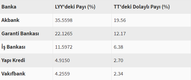Habertürk’ten Necdet Çalışkan’ın haberine göre LYY’deki en büyük pay yüzde 35.5598 ile Akbank’ı olurken, Akbank’ı yüzde 22.1265 pay ile Garanti Bankası, yüzde 11.5972 payla İş Bankası, yüzde 4.9150’lik hisse oranıyla Yapı Kredi ve yüzde 4.2559’lik payla Vakıfbank izledi.