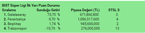 Önceki yılın istatistiklerine bakarsak, 2015/2016 sezonunun ilk yarısı 14 Ağustos-27 Aralık tarihleri arasında oynandı. Aynı getiri analizimizi bu tarihler arası için de uygularsak, Beşiktaş yüzde 12,3’lük getirisi ile yatırımcısını güldüren tek kulüp oluyor ve hem ligin ilk yarısını hem de sonunu şampiyon kapatıyor. Diğer 3 kulüp ise o dönem içerisinde yatırımcısını zarara uğratıyor: Trabzonspor (-%3,70), Fenerbahçe (-%3,78), Galatasaray (-%25,10).