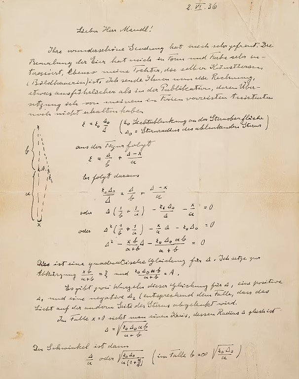 Ünlü fizikçi Albert Einstein, 1936’da üç sayfalık bir kağıda yerçekimsel bir merceğin diyagramını ve 30’dan fazla karmaşık hesaplamayı not etti. Şimdi bu belge, ‘Yerçekimi alanındaki ışığın sapmasıyla bir yıldızın lens benzeri hareketi’ adlı makalesinin taslağıyla birlikte satıldı.