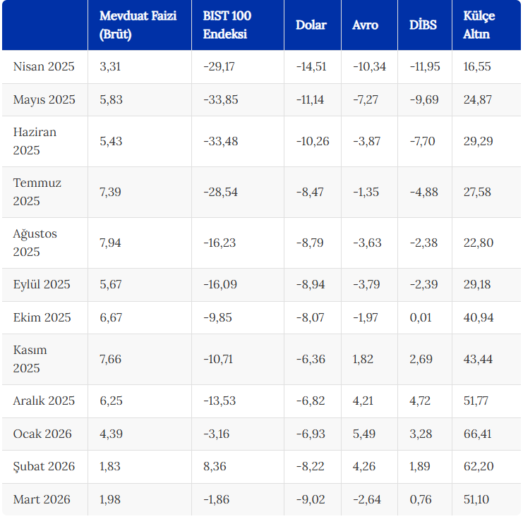 Mevduat faizi, aynı zamanda, martta aylık bazda da reel getiri sağlayan tek yatırım aracı olarak kayıtlara geçti.