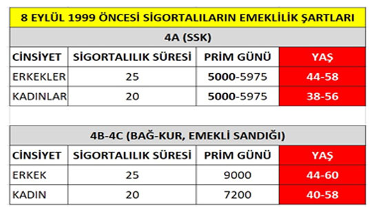 Mevcut durumda 1999 öncesi sigorta girişi olan vatandaşların emeklilik şartlarına bakacak olursak; 4A SSK dediğimiz kategoride yer alan kadınlar ve erkeklerin 20 ve 25 yıl sigortalılık süresiyle 5.000 ila 5.975 gün primi tamamladıklarında emeklilik için yaşı beklediğini görüyoruz.