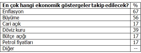 Fon Yöneticileri yatırım kararlarını alırken yılın ilk çeyreğinde en fazla enflasyon ve büyüme verilerini takip edecek. Anketin bu sorusunda katılımcılara yine iki seçenek işaretleme hakkı tanındı. Katılımcıların yarısından fazlası tarafından en önemli göstergeler enflasyon ve büyüme olarak ortaya konuldu. Onların en yakın takipçisi ise döviz kuru oldu.