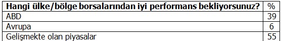 Anket katılımcılarının yarısından fazlası küresel hisse senedi piyasalarında ilk çeyrekte gelişmekte olan piyasalardan iyi performans beklediğini belirtti. Son iki çeyreğin favorisi ABD ise bu kez gelişmekte olan piyasaların gerisinde kaldı.