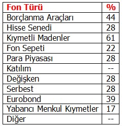 Anket katılımcılarının - üç fon türüne yer verdikleri- tavsiye listesinde %61 ile en fazla Kıymetli Madenler fonları yer aldı. Ardından gelen Borçlanma Araçları %44 ve Eurobond Fonlar %39 oranında katılımcının listesinde yer buldu.