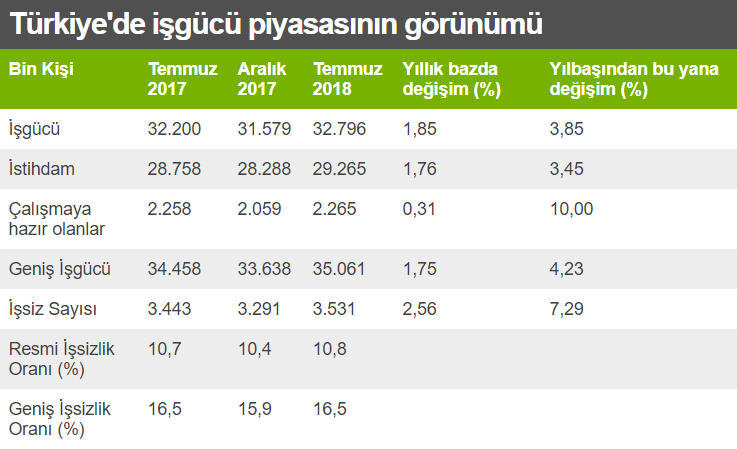 Tabloya göre Türkiye'de istihdam edilenlerin sayısında gerek 2017 Temmuz'una gerekse 2017 yılsonuna göre artış var.