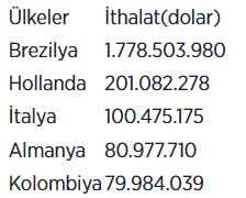 Son 10 yılda, Türkiye'ye kahve ithalatının en çok yapıldığı ülkelerin başında 1 milyar 778 milyon 504 bin dolarla Brezilya gelirken, bu ülkeyi 201 milyon 82 bin dolarla Hollanda, 100 milyon 475 bin dolarla İtalya izledi. Aynı dönemde Almanya'dan 80 milyon 978 bin dolarlık ve Kolombiya'dan 79 milyon 984 bin dolarlık ithalat gerçekleştirildi.