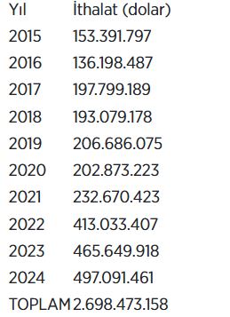 2015-2024 döneminde toplam kahve ithalat-ülke tutarları şöyle: