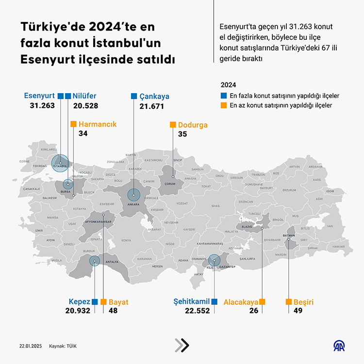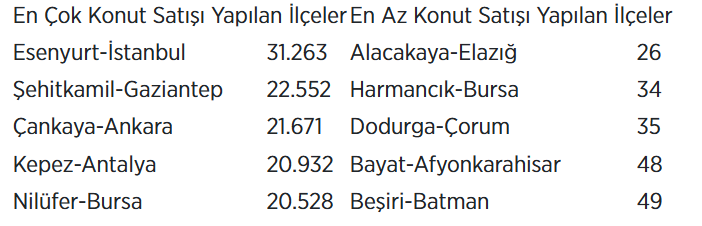 İlçe bazında bakıldığında ise İstanbul Esenyurt, 31 bin 263 ile en çok konutun satıldığı ilçe olarak kayıtlara geçti. Böylece Esenyurt, aralarında Trabzon, Diyarbakır, Aydın ve Manisa'nın olduğu Türkiye'deki 67 ili geride bıraktı.