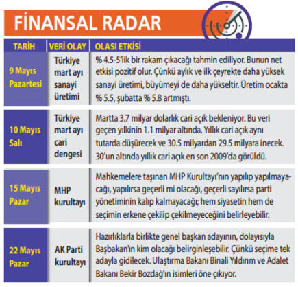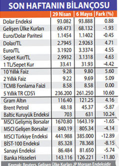 İçerideki siyasi gelişmeler dışarıdaki satış dalgasıyla birleşince mayıs ayına Türkiye piyasaları yüksek türbülansla girdi. Bir haftayı geride bırakırken türbülans azaldı gibi ama belli bir hasar da oluştu. Aşağıdaki tablodan finansal varlıkların bir haftalık değişimi izleniyor.