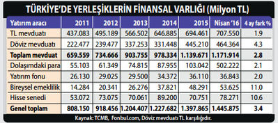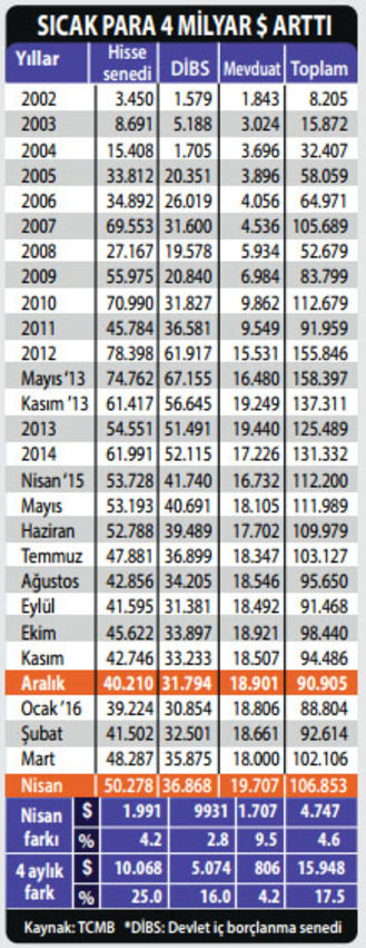 Türkiye’de tasarruflar artmıyor. Yukarıda yer alan tablo yurtiçi yerleşiklerin toplam finansal varlıklarının yılın 4 ayında artmadığını gösteriyor. TL mevduatta yüzde 1.9 artış, 4 ayda alınan faiz gelirinin bile yarısında. Boşluğu dışarıdan gelen sermaye dolduruyor. Nitekim net kısa vadeli sermaye tutarı nisanda 1.33 milyar dolar, son 4 ayda 4 milyar dolar oldu. Sıcak para stoku ise 16 milyar dolar arttı. Nisan ayı artışı 4.7 milyar dolar kadar.