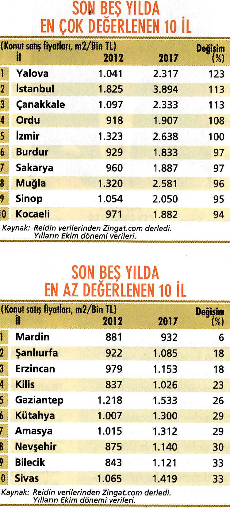 Peki Türkiye'nin kentlerinde son beş yılda nasıl bir gayrimenkul hareketliliği yaşanıyor? İşte bu sorudan yola çıkarak, Reidin Zingat.com, verilerinden yararlanarak Ekonomist Dergisi'ne özel bir araştırma yaptı. Bu araştırmayla Türkiye'de son beş yılda konutta metrekare fiyatları en çok artan 10 il ile en az artan 10 il ortaya çıkarıldı. Bu araştırmanının sonucu da son beş yılda değeri en çok artan ilk üç ilin Yalova, İstanbul ve Çanakkale, değeri en az artan ilk üç ilin ise Mardin, Şanlıurfa ve Erzincan olduğunu gösterdi.