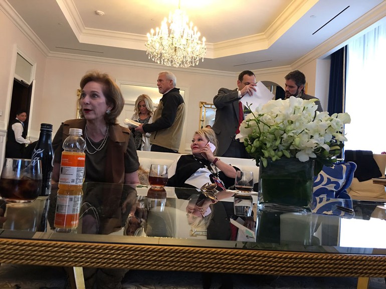 Aynı anlarda Barack Obama’nın Beyaz Saray’daki son basın toplantısı devam ediyordu. Trump ailesine yakın oldukları hal ve tavırlarından anlaşılan davetliler Obama’yı “Bu da hala neden konuşuyorsa. Kaç basın toplantısı yaptı hala devam edemedi” türünden yorumlarla göz ucuyla seyrettiler. Sohbetlerin ana konusu açık havada Kongre binasında düzenlenecek olan yemin töreni sırasında yağmur yağıp yağmayacağıydı. Özellikle yüz estetikleriyle dikkat çeken kadınlar birbirlerine Trump ve eşi Melania’nın Sinatra’nın ‘My Way’ şarkısıyla ilk dansı yapacakları baloda giyecekleri tuvaletleri tarif ediyordu.