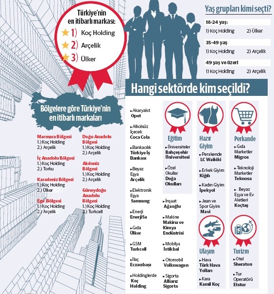 Türkiye’nin en itibarlı markası üst üste 7 kez Koç Holding oldu. İtibar Group bünyesinde faaliyet gösteren Türkiye İtibar Akademisi tarafından bu yıl 7’ncisi gerçekleştirilen Türkiye İtibar Endeksi Araştırması’nın yeni sonuçları açıklandı. Araştırmanın raporlaması ve denetimi Yıldız Teknik Teknik Üniversitesi İstatistik Bölümü’nce yapıldı. Araştırmaya göre, Türkiye’nin en itibarlı markası 7. kez üst üste Koç Holding olurken, 2. sırada Arçelik, 3. sırada ise Ülker yer aldı.