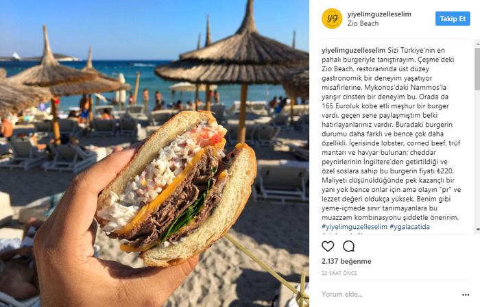 'Sizi Türkiye'nin en pahalı burgeriyle tanıştırayım. Çeşme'deki Zio Beach, restoranında üst düzey gastronomik bir deneyim yaşatıyor misafirlerine. Mykonos'daki Nammos'la yarışır cinsten bir deneyim bu. Orada da 165 Euroluk kobe etli meşhur bir burger vardı, geçen sene paylaşmıştım belki hatırlayanlarınız vardır. Buradaki burgerin durumu daha farklı ve bence çok daha özellikli. İçerisinde lobster, corned beef, trüf mantarı ve havyar bulunan; cheddar peynirlerinin İngiltere'den getirtildiği ve özel soslara sahip bu burgerin fiyatı ₺220. Maliyeti düşünüldüğünde pek kazançlı bir yanı yok bence onlar için ama olayın "pr" ve lezzet değeri oldukça yüksek. Benim gibi yeme-içmede sınır tanımayanlara bu muazzam kombinasyonu şiddetle öneririm.'