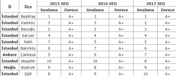 2015 – 2017 dönem aralığında en yaşanabilir ilçelerin başında gelen İstanbul'un Beşiktaş ilçesi, 2017'de de zirveyi kaptırmadı. Aynı dönem içinde yerini korumayı başaran bir diğer bölge de, 4'üncü sırada yer alan İstanbul'un Sarıyer ilçesi oldu. Çalışma sonuçları sıralama yönüyle değerlendirildiğinde ise, İstanbul ilçelerinden Kadıköy'ün Beyoğlu'nu geride bırakıp 2017'de ikinci sıraya yükseldiği görülüyor.