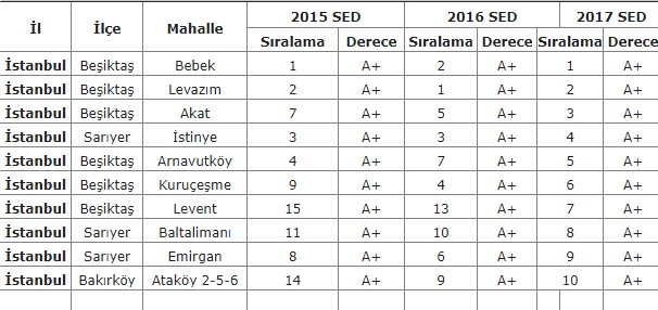 2017 sosyoekonomik derecelendirme sonuçlarına göre, ilçe seviyesinde lider olan İstanbul'un, mahalle düzeyinde de liderliğini koruduğu dikkat çekiyor. 2016 sonuçlarına göre, 1.255 mahalle arasında ikinci sırada yer alan Bebek, 2017 yılında en yaşanabilir mahalleler arasında zirveye oturmuş durumda. Levazım, Akat, İstinye ve Arnavutköy mahalleleri ise Bebek ile birlikte ilk beşte konumlanan bölgeler olarak görülüyor.