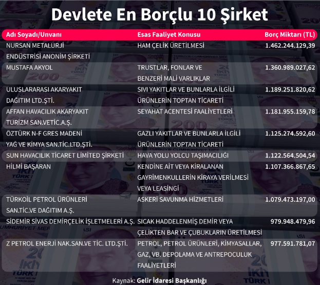 Devlete toplam 47 bin 32 kişi ve kuruluşun 1 milyon liranın üzerinde vergi borcu bulunuyor. Listenin ilk sırasında Dörtyol Vergi Dairesine kayıtlı 1 milyar 462 milyon 244 bin 129 liralık borçla Nursan Metalurji Endüstrisi AŞ yer aldı.