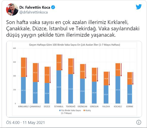 Bakan Koca, Twitter hesabından yaptığı açıklamada, "Son hafta vaka sayısı en çok azalan illerimiz Kırklareli, Çanakkale, Düzce, İstanbul ve Tekirdağ. Vaka sayılarındaki düşüş yaygın şekilde tüm illerimizde yaşanacak" ifadelerini kullandı.