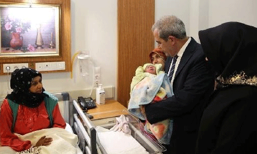 Hastaneye gelen Vali Deniz, aileleri tebrik ederek, bebeklere çeyrek altın hediye etti.