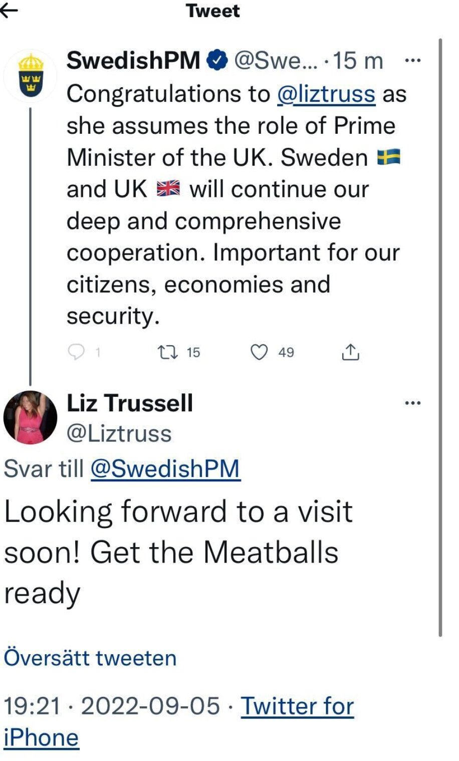 @liztruss adlı hesabın sahibi Liz Trussell ise Andersson'a şaka yollu bir yanıt vererek, "En kısa zamanda görüşmeyi ümit ediyorum. Köfteleri hazırla!" ifadelerini kullandı.